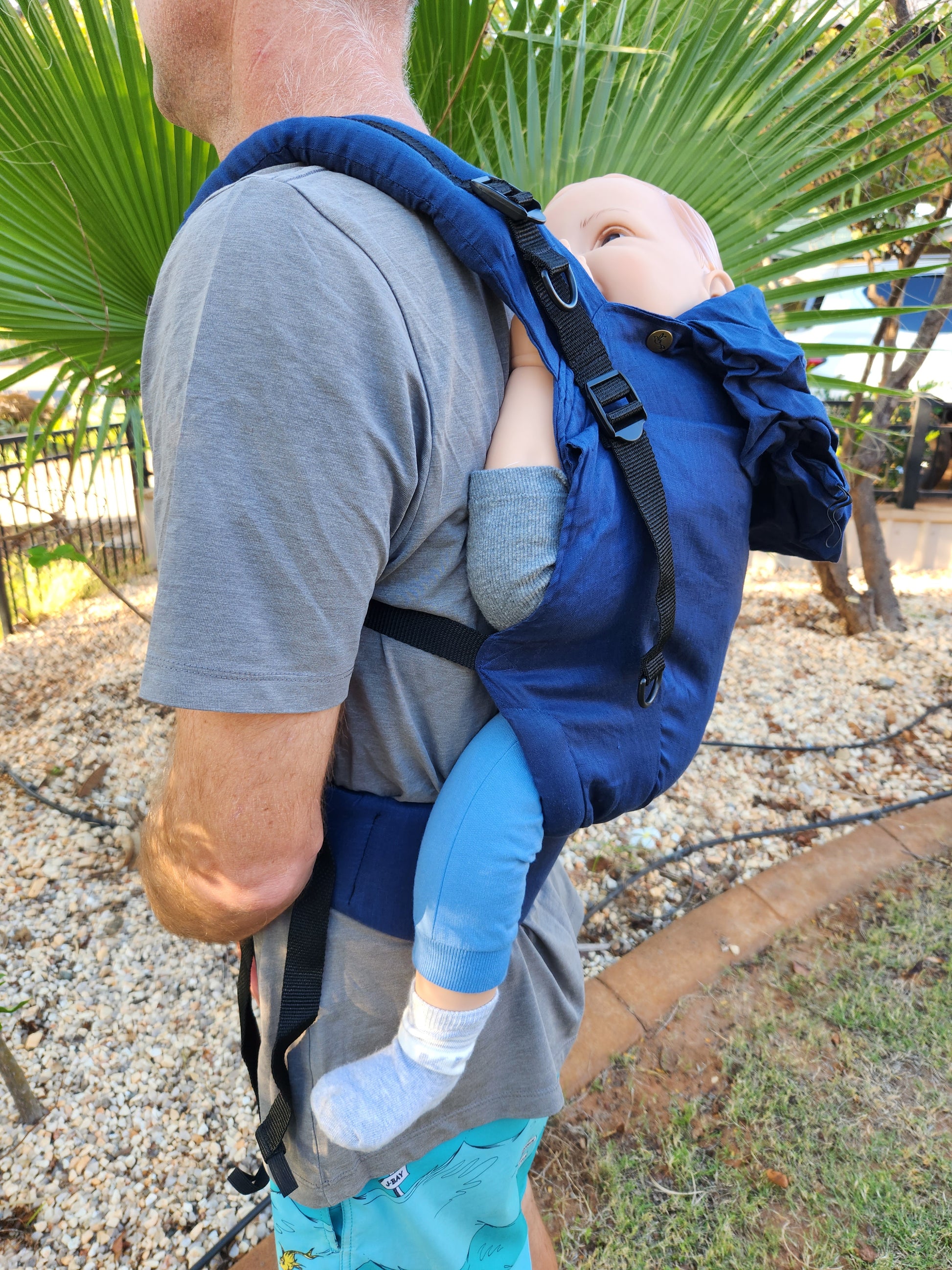Toddler-Preschooler: The panel size is 19” wide and 21.5” tall. This carrier can cinch down to 12” wide and 13” tall. Weight up to 25kg. Demo doll David is a little bit small for this carrier, and he is about 68 cm tall and wears size 0 clothes.