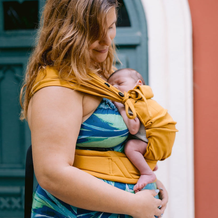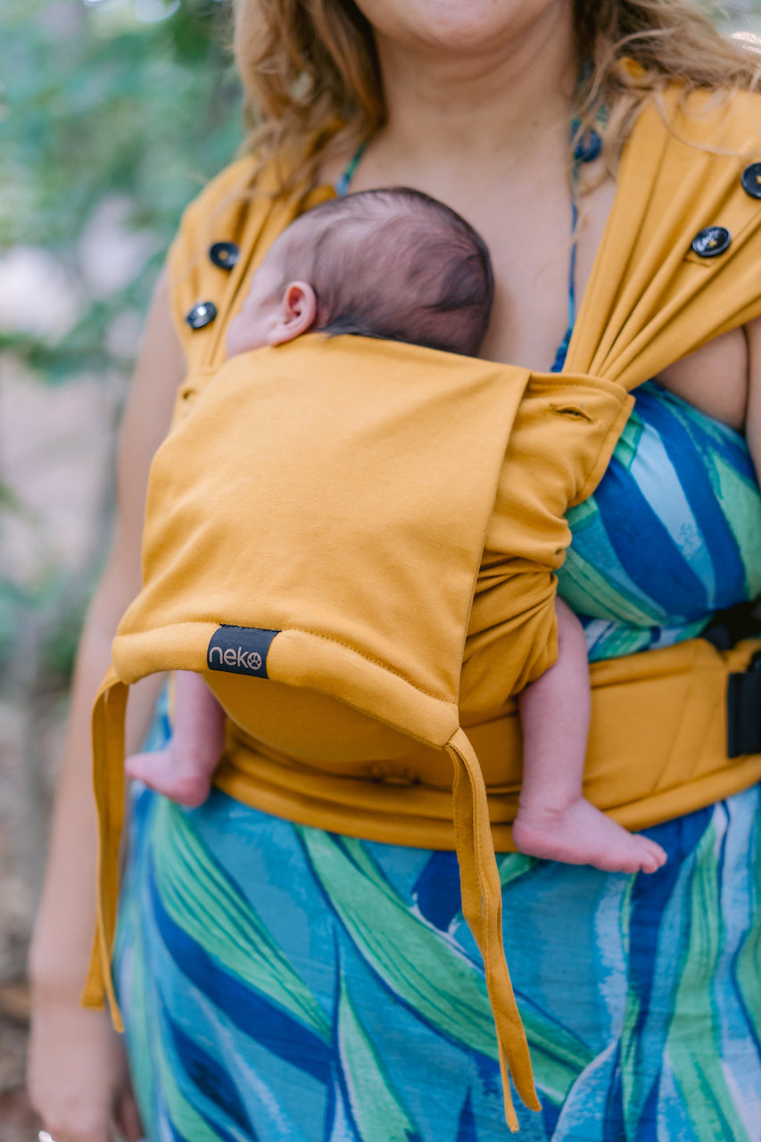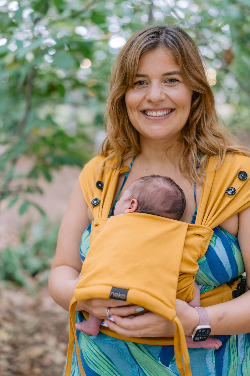 Innovative hybrid carrier from Neko Slings made out of stretchy wrap. Designed for little babies who have low birth weight. Neko Tiny was tested up until 15kg by independent labs.